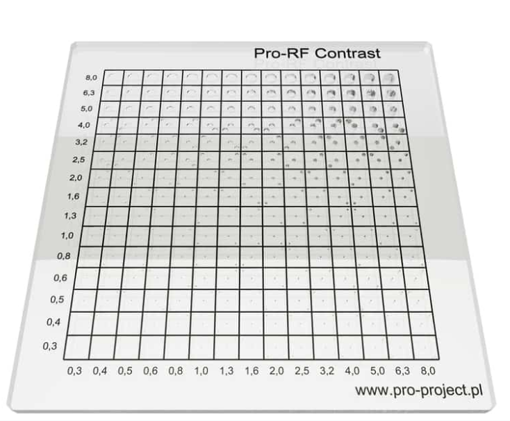 The Contrast-Detail (CD) phantom makes it possible to quantify both detail and contrast as observed by the radiologist. It can be used within the entire range of radiography diagnostic imaging systems, such as fluoroscopy and angiography. It has 405 holes that generate subtle changes in contrast.